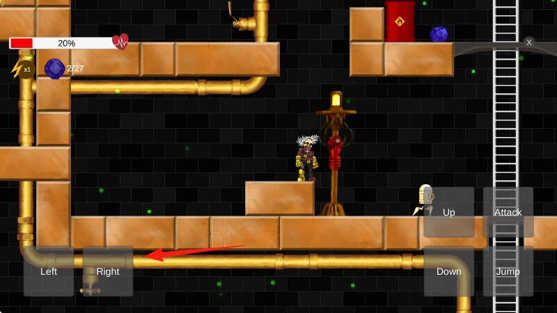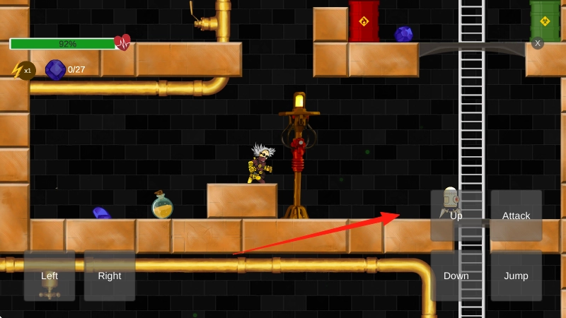 操控角色黄色装扮,用左右键移动,遇到Up,Attack等提示,按对应按钮互动、攻击。