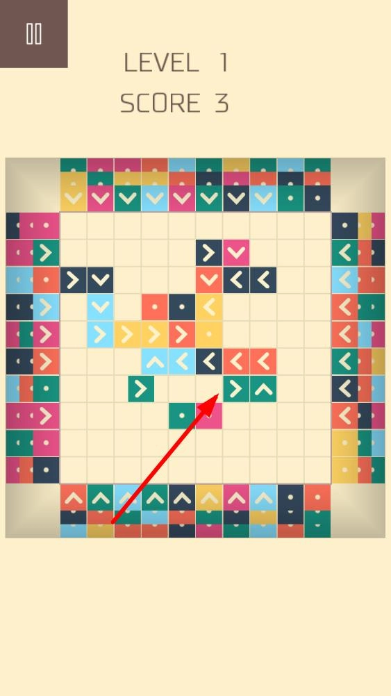 同色聚集策略:观察方格中各色方块分布,优先点击箭头方块将同色方块向同一区域移动,创造三个及以上相邻的机会,避免零散移动导致方块分布混乱集中同色方块。