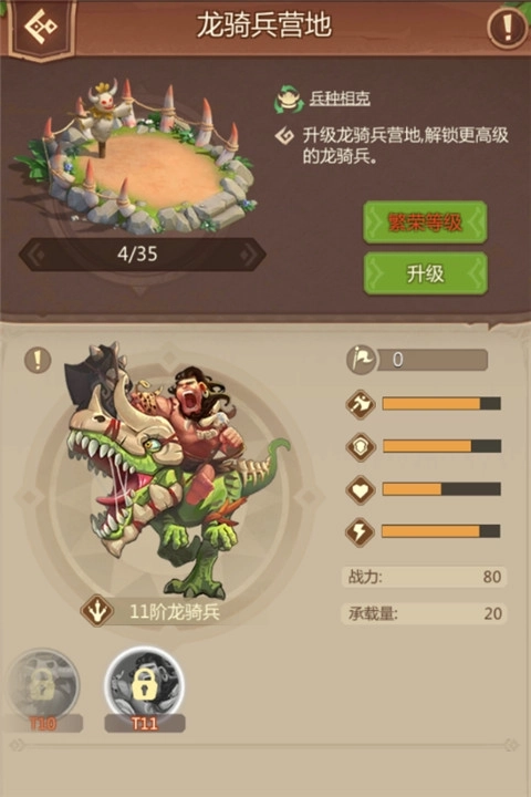 1、游戏内设有四大基础兵种,分别是防御能力出色的战士、输出能力强劲的猎人、机动性突出的龙骑兵,以及资源运输效率极高的巨兽。不同兵种在属性上各有特点,并且随着阶数的提升,它们的各项能力也会持续得到增强。