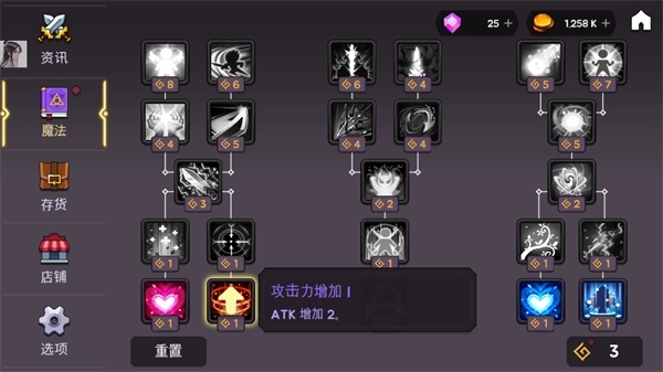 5、点击魔法按钮可对角色天赋进行升级,右下角显示的是升级点数,左下角的按钮则能重置天赋。