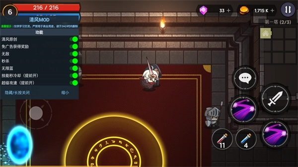 10、在进入战斗前,玩家还能点击左上角的头像打开菜单选项,其中包含无敌、秒杀、无限蓝、金币不减反增等各类修改功能。