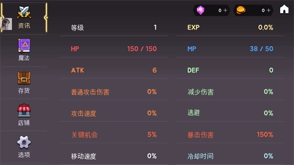 4、点击顶部的资讯选项,即可查看角色的所有属性,涵盖HP、MP、ATK、移动速度、攻击速度、防御、闪避等各项内容。