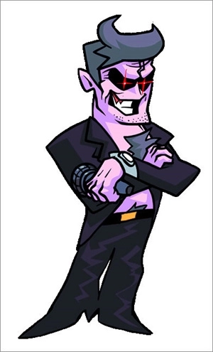 他的模样与恶魔极为相似,紫色的皮肤配上红色的瞳孔,身着黑色西装外套,灰色胸毛显露在外,手中握着麦克风,整体形象给人强烈的压迫感。