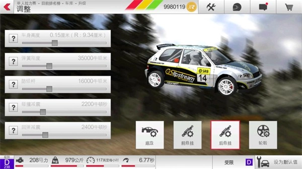 2、悬挂系统:悬挂分为前悬挂与后悬挂两部分,二者可调节的属性一致。提升车身高度有助于增加弹簧的工作行程,在车辆遇到弹跳或颠簸时,能降低翻车的风险。若前车身升高而后车身降低,车辆容易出现转向不足的倾向;反之,前车身降低而后车身升高,则可能导致转向过度。弹簧刚度方面,前低后高的设定能提升车辆的加速度表现;刚度数值较大时,悬挂会更硬,此时通过连续凹凸路面会比较吃力,车辆容易弹跳,但抓地力会相应增强;若刚度数值较小,悬挂则更软,通过凹凸路面会更顺畅,不过抓地力会有所下降,这种情况下过弯时建议配合手刹使用。防倾杆的作用可类比车辆的配重调节,它能有效抑制车辆转弯时的侧滑现象;当前悬挂防倾杆数值高、后悬挂数值低时,车辆易出现甩尾;而前悬挂数值低、后悬挂数值高时,则更容易实现漂移动作。
