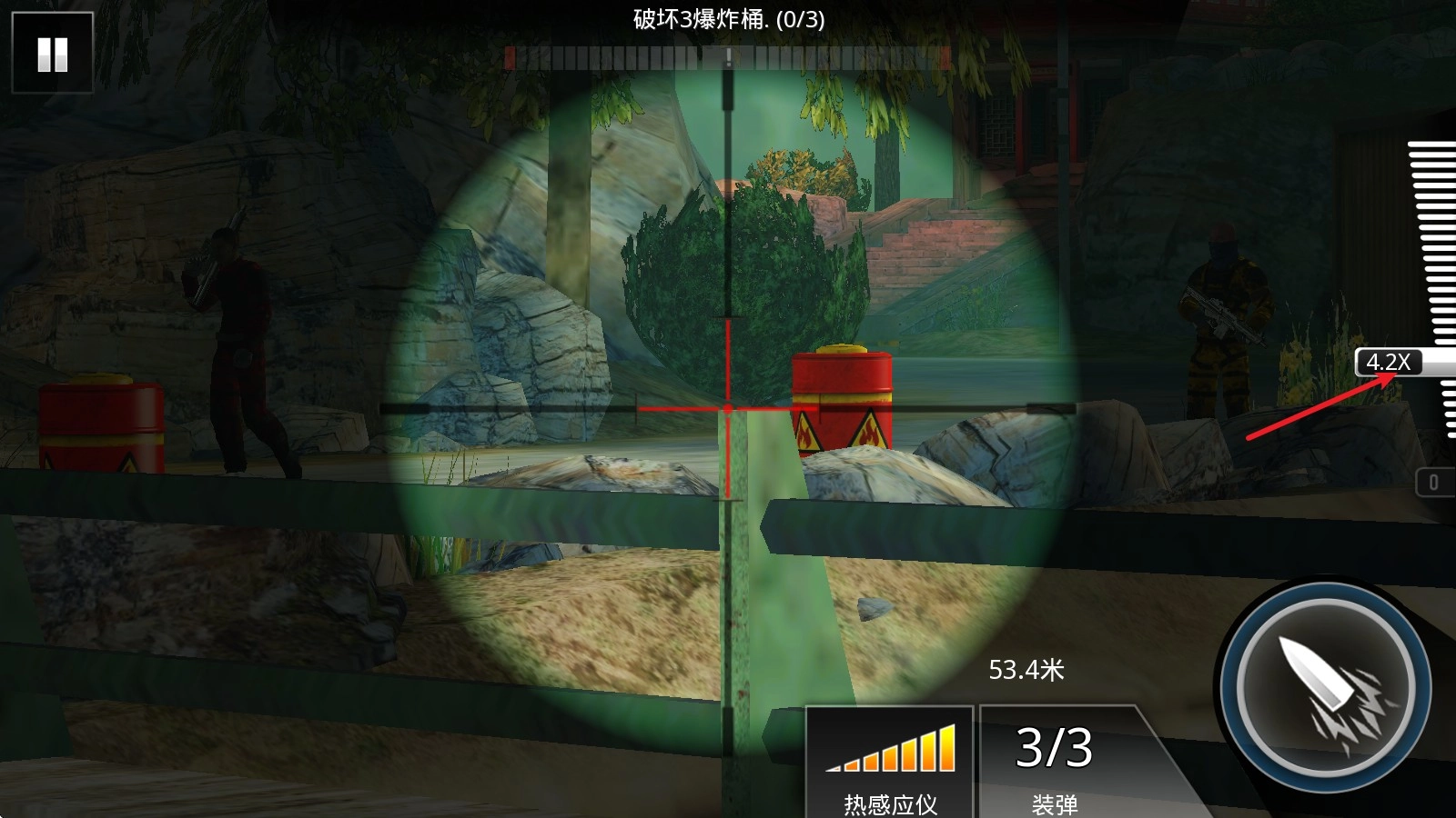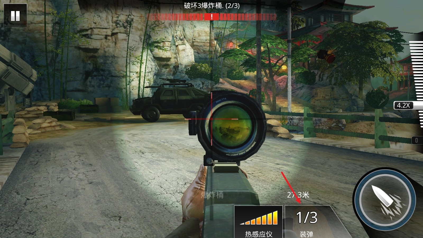 3、进入场景后,推动右侧的进度条,我们就可以打开狙击镜进行瞄准了。