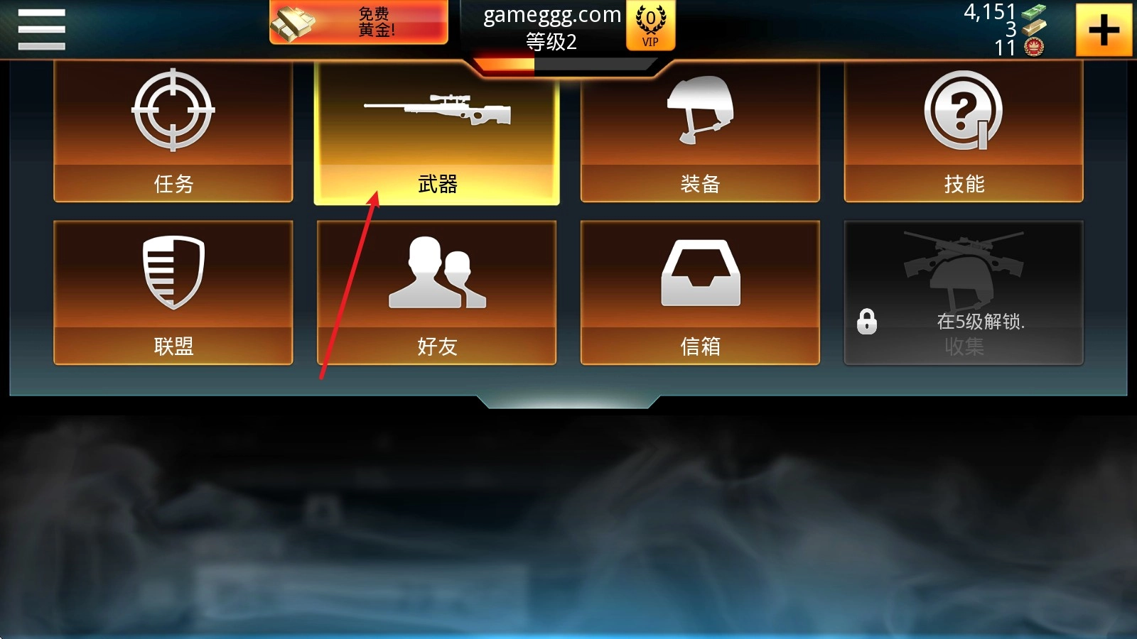 1、首先点击左上角的菜单,进入到武器界面。