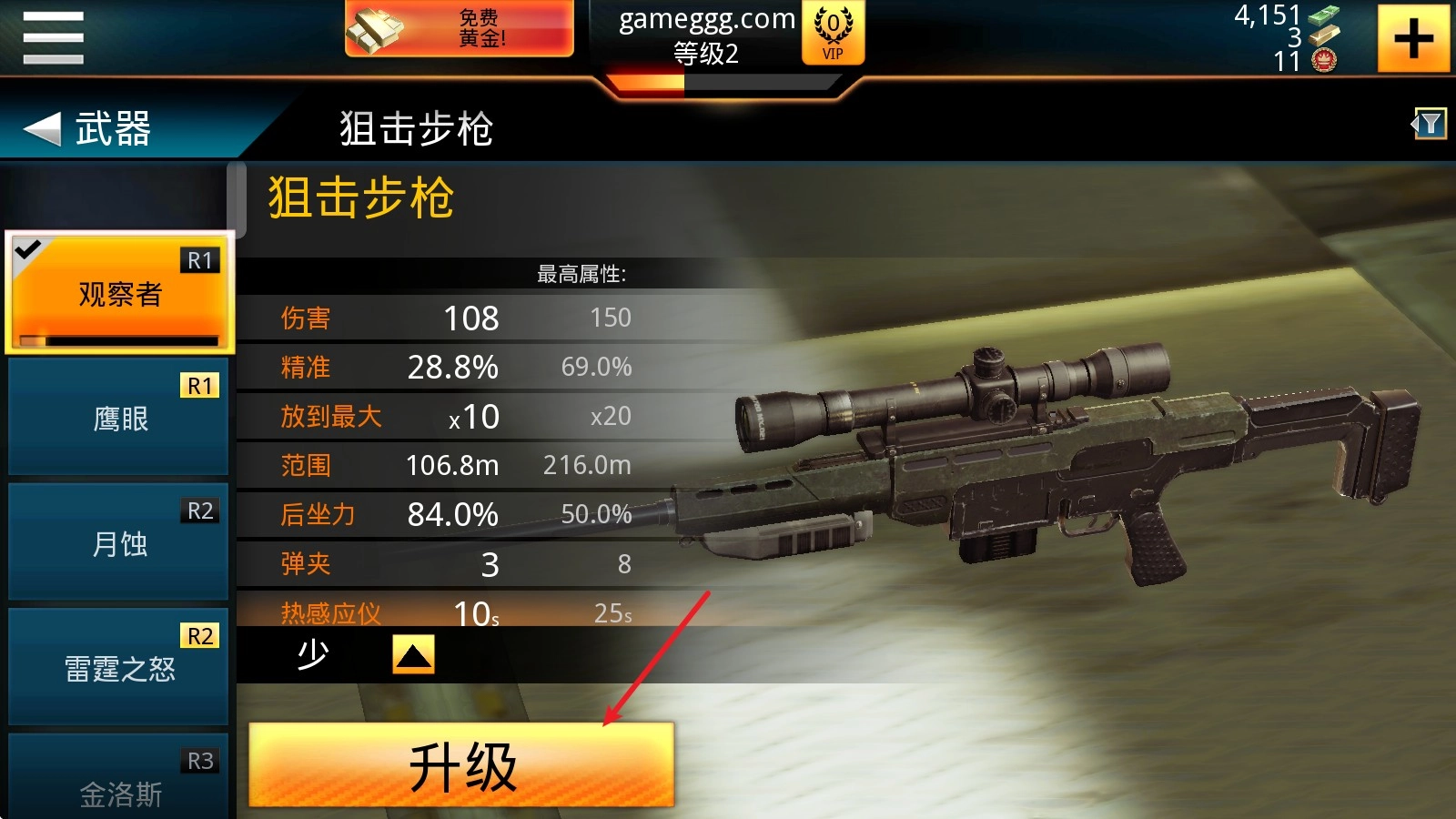 3、在左侧点击要升级的武器,点击升级。