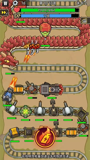 动态战斗与能量加速:火车前行时炮塔会自动攻击沿途敌人,车头还能直接撞击敌人。长按屏幕中间的能量按钮,可同时提升火车前进速度和所有炮塔的攻击速度,便于快速突破敌人密集区域。