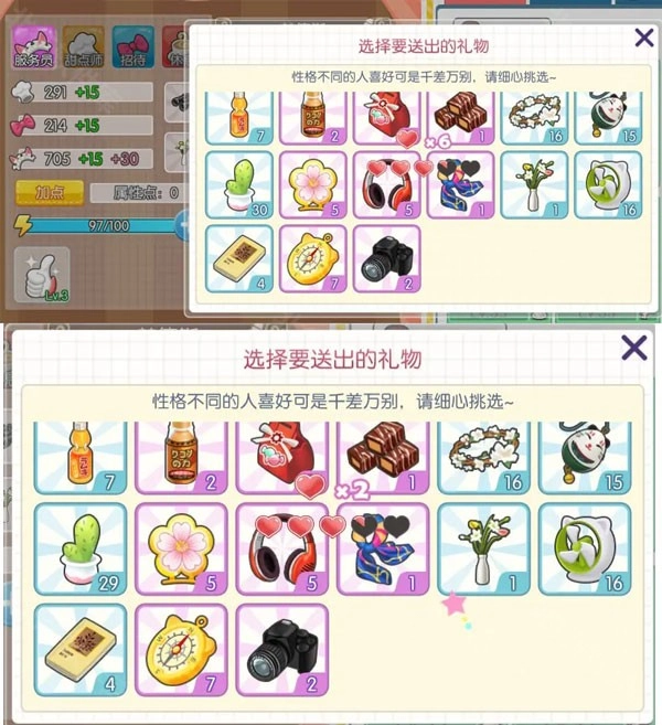 每位店员都有自己的嗜好品,赠送对应的嗜好品可以显著提升好感度。如果赠送的不是指定的嗜好品,增加的好感度会少很多。例如,赫德斯的嗜好品中有蓝色品质的插花瓶,赠送后好感度可增加6点;而赠送非嗜好品的仙人掌时,好感度仅增加2点。建议玩家根据店员的喜好赠送礼物,以避免浪费。