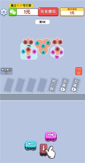 《开车打螺丝赚钱游戏》是一款既烧脑又有趣的休闲闯关类手机游戏!进入游戏后,你会看到汽车堵成一团,不过无需复杂操作,直接就能开始游玩,过程十分欢乐!在开车打螺丝红包版里,玩家需要操控不同颜色的小车,运送对应颜色的螺丝,只要成功清除所有螺丝就能过关,还能领取红包奖励。游戏玩法简单休闲,过关轻松,奖励也特别丰厚!