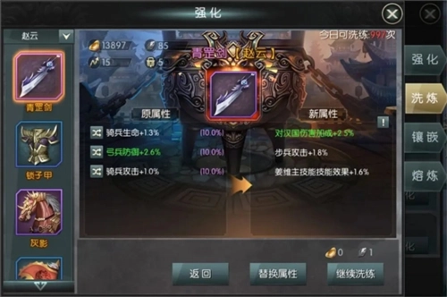 若想获得理想属性,既可以选择替换现有属性,也能继续洗炼直至得到想要的属性。