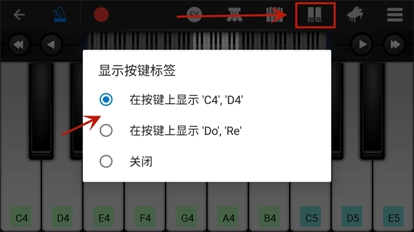 1、打开完美钢琴应用,进入弹奏界面后,找到右上方的第三个图标并点击,即可开启按键数字显示功能。