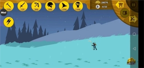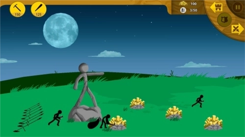主界面会呈现战斗场景。屏幕左侧分布着你的要塞、一座雕像以及金矿脉。若想侦察敌军,可在屏幕上向右滑动。在此处,你能够掌握敌人发起进攻的时间,并判断自己获胜的概率。
