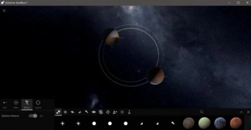 在屏幕的左下角有四种模式(Still,Orbit,Binary,Launch)他们可以调节各个添加的星体间的运行方式。