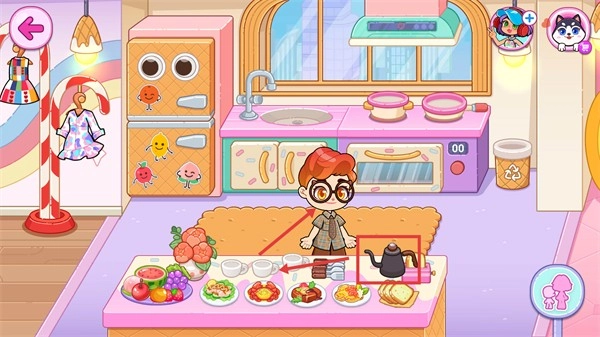 2、进入厨房界面后,按照指引找到并获取【水壶】,接着将它与桌上的餐具和餐品进行搭配,完成相应的物品操作任务,从而推动厨房互动流程的进行。