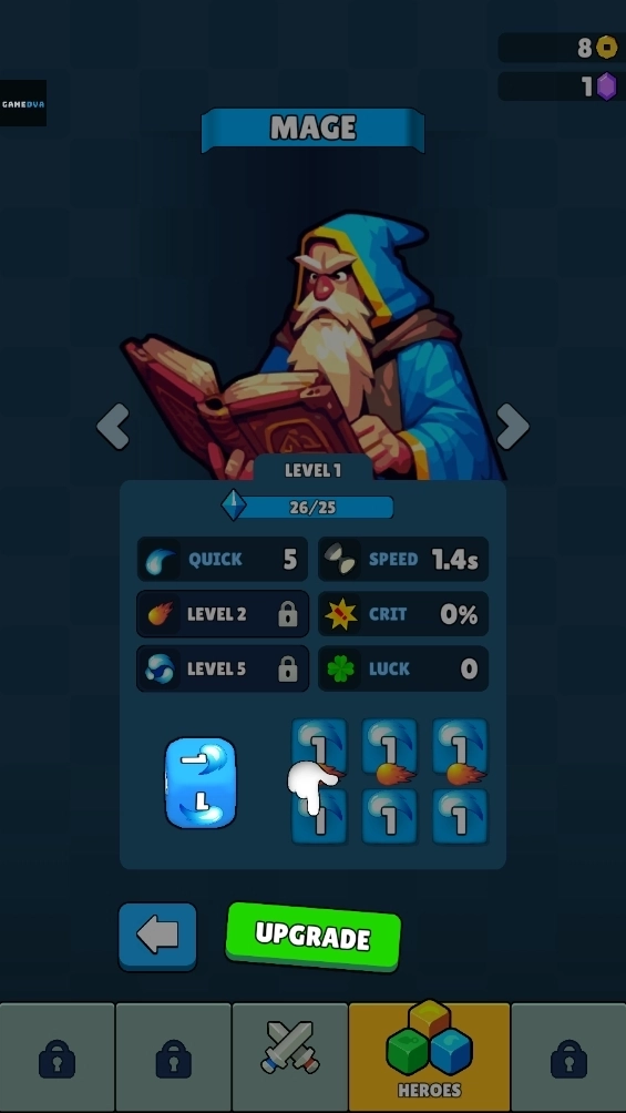 5、之后回到游戏主界面,点击方块形状的按钮,就能为你的英雄提升等级。