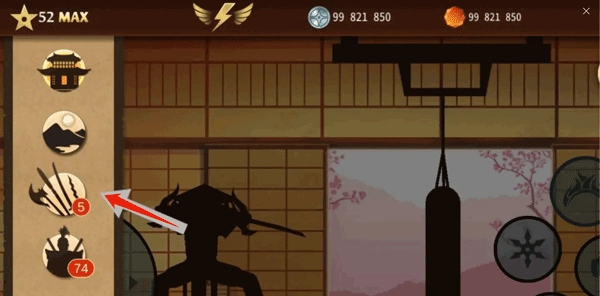 打开菜单栏后,你会看到五个菜单选项图片,我们在这里选择第三个兵器图标。