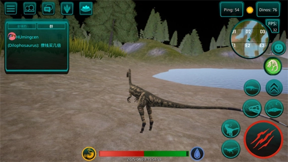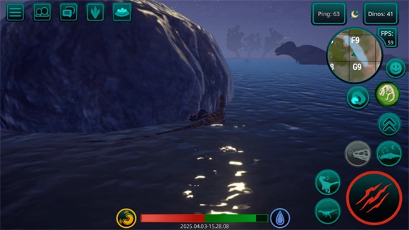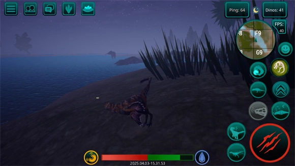 进入游戏后,左侧的操作区域用于控制恐龙移动,右侧则分布着奔跑、跳跃和攻击按键;屏幕下方中间位置显示的是你的血量与体力,两侧分别为饥饿值和饥渴值。当找到食物时,点击带有爪子图标的按钮即可进食。