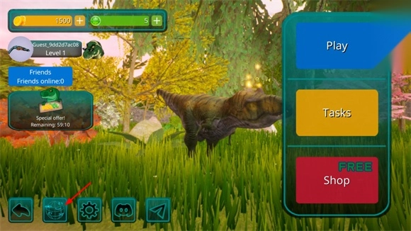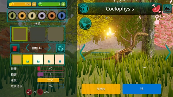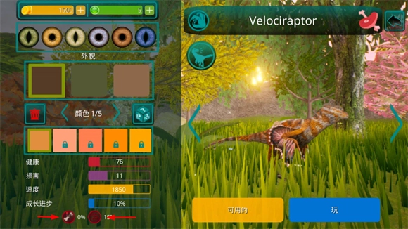 在主界面点击“玩”即可选择想要游玩的恐龙,通过点击左右箭头能够切换不同的恐龙种类。屏幕左侧设有恐龙自定义功能,下方则展示着恐龙的具体数值。当你拥有足够金币时,点击“买”就能解锁对应的恐龙。