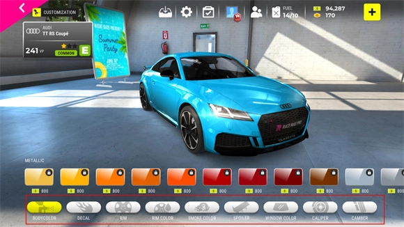 2、在改装界面能够对车辆的轮胎、喷漆、尾翼等各类部件进行改装操作。