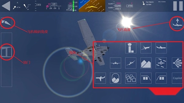 玩家进入游戏后,会看到界面左右两侧设有控制按钮:左侧的按钮用于调整飞机的倾斜角度和控制油门,右侧的按钮则可以调节飞行视角与飞行高度。