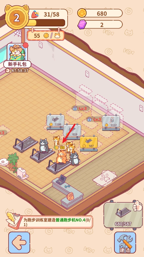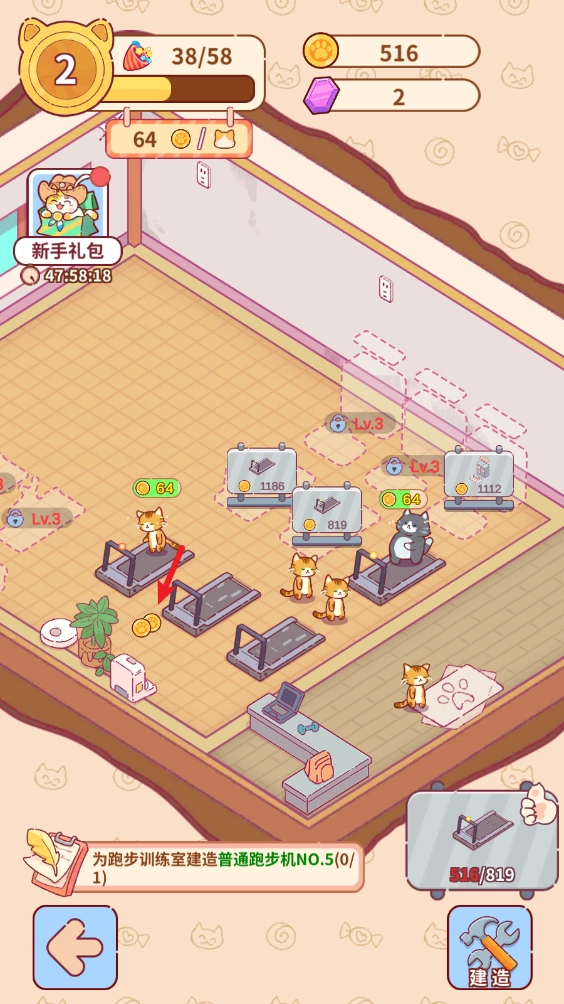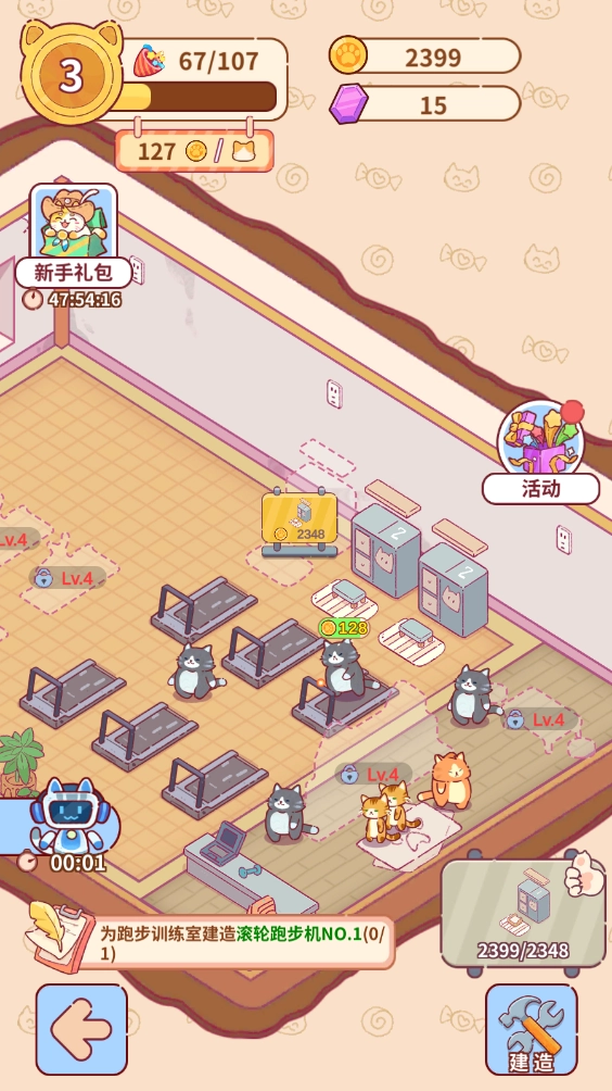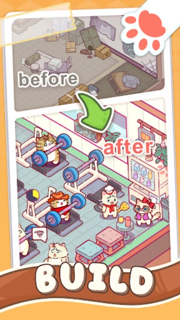 你可以自由打造专属的猫咪健身房,持续地建设并升级各类健身设备,以此提升经营收益,获取更多金币。