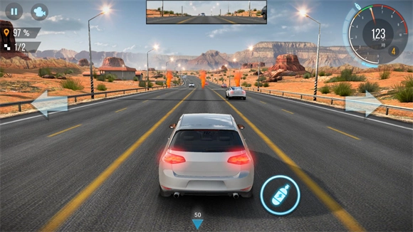 进入比赛后汽车会自动前进,点击左右箭头控制方向,点击蓝色按钮即可使用喷气加速。