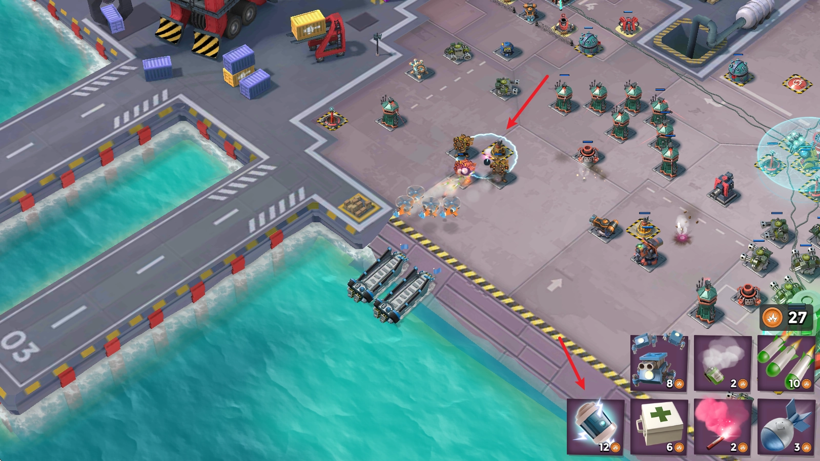 战斗过程中,我们也能借助部分武器完成远程支援,像这里便是利用干扰器使敌方的防御塔陷入瘫痪状态。