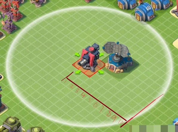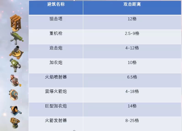 表内防御建筑的攻击距离,指的是从建筑中心点到攻击范围最远端的距离;若不需要包含这部分,可自行将数据减去1。