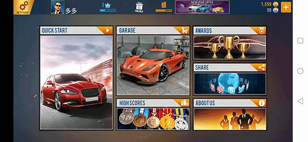 首先打开游戏,主界面从左到右依次为quick start(快速比赛)、garage(车库)、high scores(高分榜)、awards(奖杯)、share(分享)、about us(关于)。