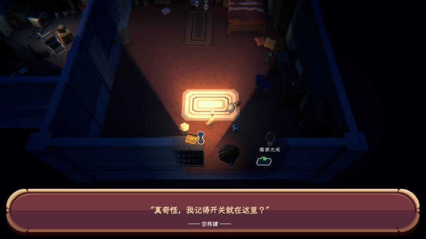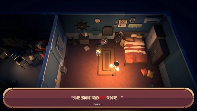 1、进入游戏后,先通过缩放镜头来全面查看室内环境,把所有光源的位置都确认清楚。这一步可以帮你规划好关灯的路线,防止漏掉重要的光源。