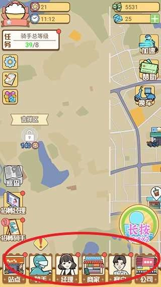 3、玩家可点击屏幕下方的站点、骑手、经理、商家、客户、公司按钮来完成升级操作。