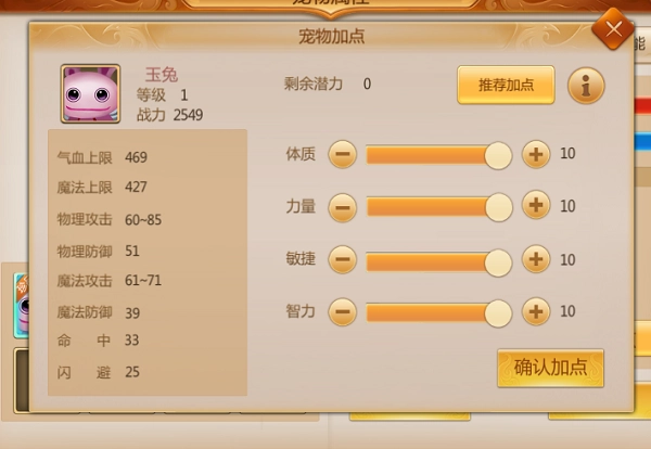 宠物升级时会得到潜力点,这些潜力点能够由玩家手动分配到宠物的基础属性上。