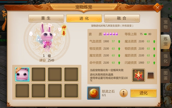 4、宠物进化可按百分比提升各项资质。