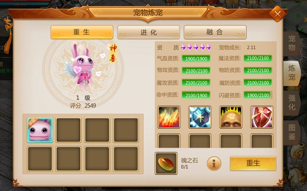 使用魄之石对宠物进行重生操作,会清除宠物已有的强化效果以及各项属性。