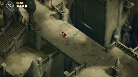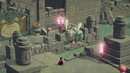 9、大门开启后径直往前走,登上楼梯后会遇到背着石像的新怪物,建议等它撞墙翻倒后再发起攻击。