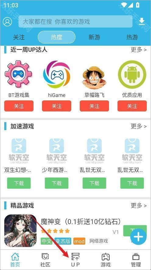 1、打开软天空后,先点击底部的【UP】创作中心入口。