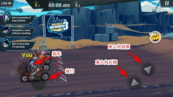 4、摩托车的操作按键就这几个,起步时的操作建议是:左手按住油门,右手通过点按来控制重心向前或向后,只要保持车身不摔倒就行。