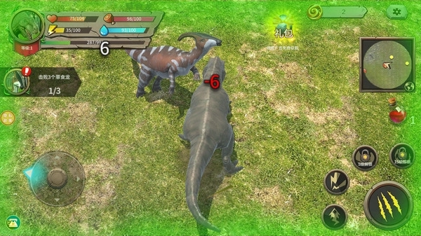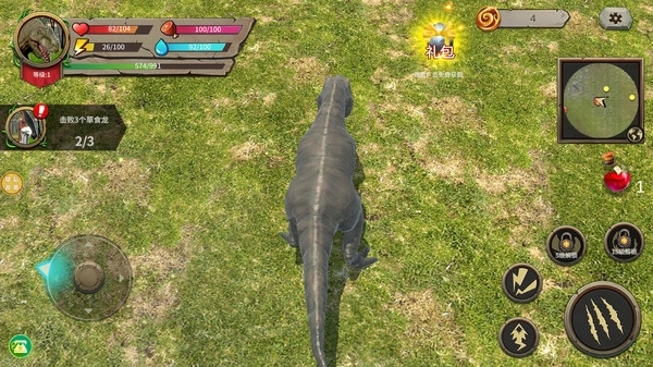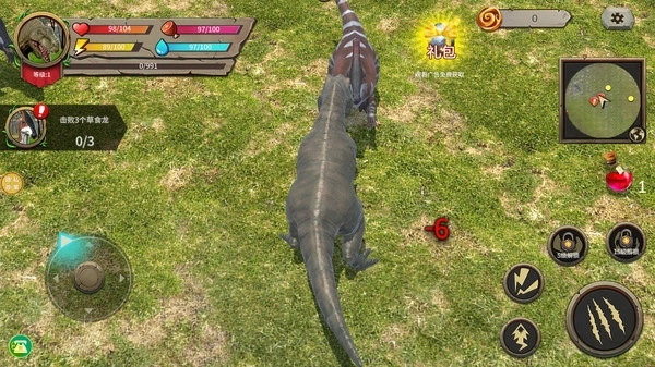 1.左侧虚拟摇杆:拖动屏幕左下角的虚拟摇杆,即可操控暴龙移动,自由探寻草地环境与猎物踪迹。