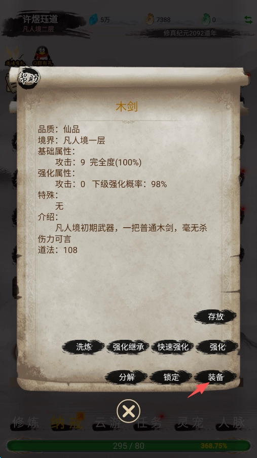 7、接着点击屏幕右下角的“装备”按钮,把所有装备逐个穿戴好,这样游戏前期就基本没什么问题了。