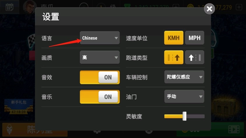 2、接着点击语言选项栏就行,还能设置速度单位、跑道类型、车辆控制等,大家可以根据自己的喜好来调整这些设置。