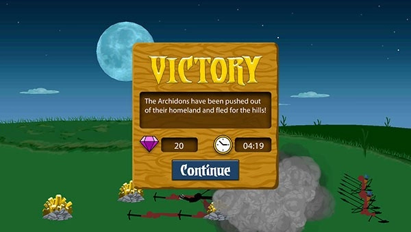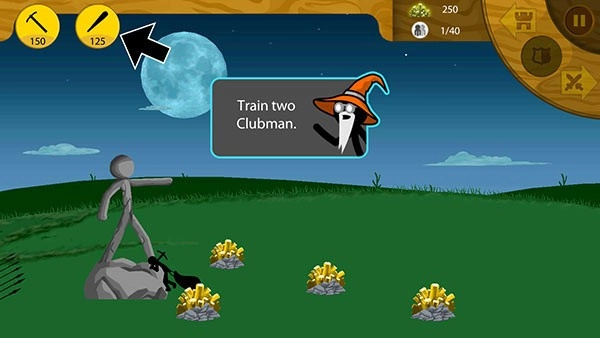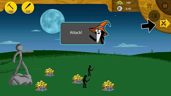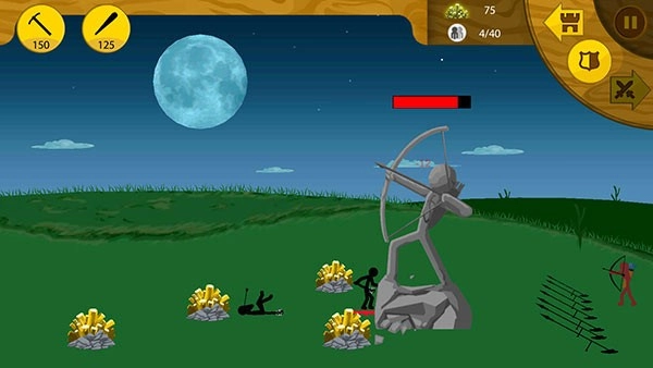 开局建议先造一把矛,接着训练8个矿工。等敌人出现后,操控矛兵迎敌,同时让矿工后撤,依靠城堡的弓兵进行射击。你只需举盾吸引敌人火力,确保他们不会攻击雕像就可以了。