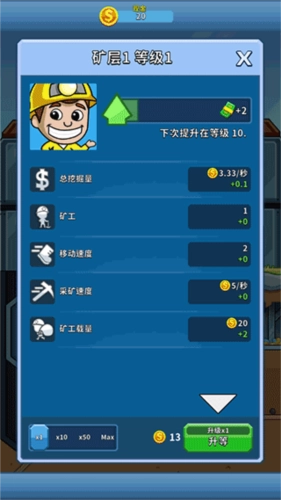 2、升级是大家比较关注的问题,它的入口在右下方黄色的“找人挖金矿”区域。当金币数量足够时,界面上会出现向上的箭头提示,此时就能进行升级操作。随着等级提升,每次挖矿获得的金币也会增加——初始1级时,单次挖矿可得11个金币;到5级时,一趟就能挖取29个金币。升级速度越快,积累的金币就越多!