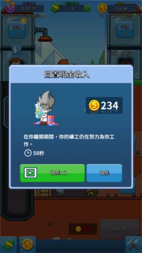 3、电梯运输与地面运输工的升级需要480个金币,升级后可提升运输速度、运输量及运输工人数等属性,玩家攒够金币即可启动升级流程。当经理头顶出现小锤子图标时,点击该图标能为开采的矿工加速,不过加速时长仅60秒。黄色矿工的箱子、电梯以及地面推小车的矿工,各自的最大金币容量均为1k。向下滑动屏幕,下方是未开采的矿区,矿区2在收集到1k金币后即可解锁。解锁的矿区越多,金币收集效率越高;雇佣经理后,矿区会持续开采,即使玩家离开游戏,经理也会监督开采进程,返回游戏界面时点击“收集”,离开期间开采的金币将全部到账。