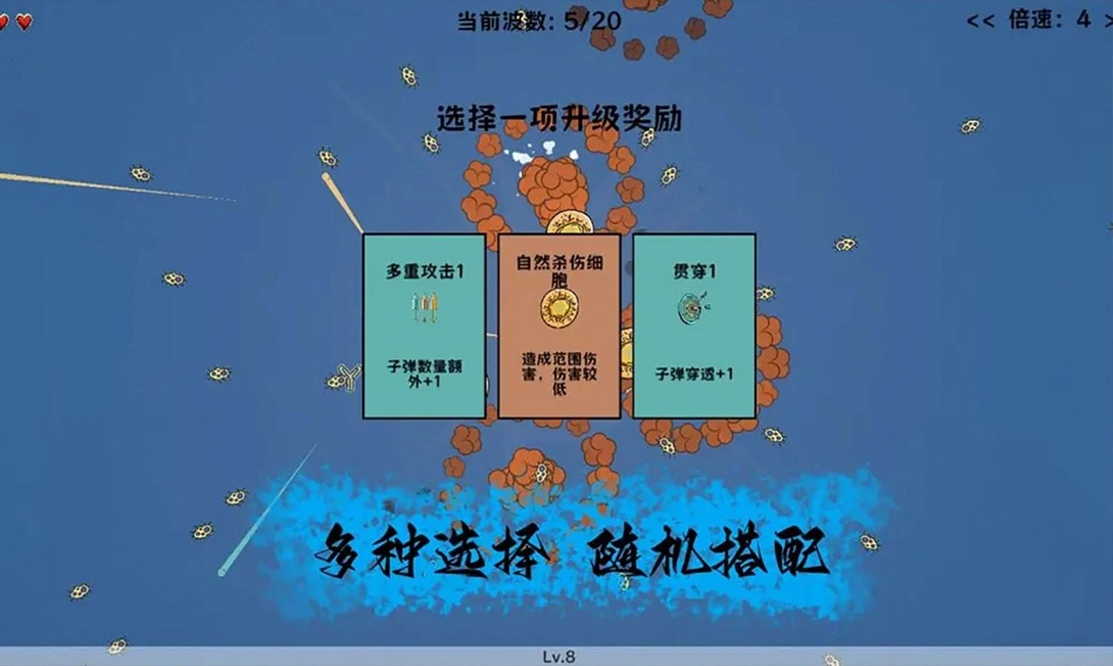 《细胞防线》是一款围绕人体免疫细胞对抗外来病原体展开,结合了塔防与rougelike元素的畅快割草游戏~