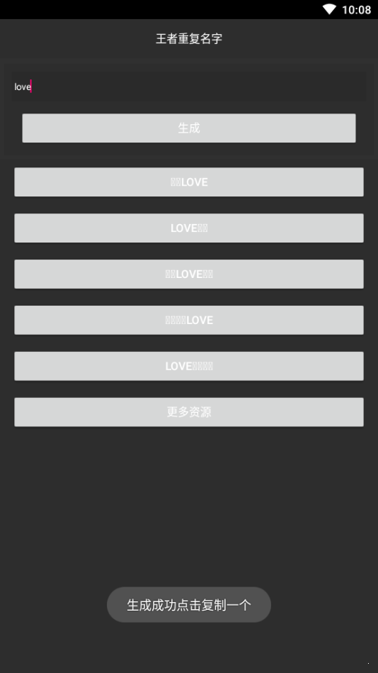 和平精英重复名生成器,能为你的游戏账号设置各式各样的名字。别看它表面普通,实际作用可不小。要是心仪的名字已被占用该咋办?用和平精英重复名生成器修改就好啦。它能生成专属代码,让你的名字从此与众不同,再也无需担忧名字重复。这款软件里有海量游戏名字供你设置,还能设置情侣网名,是一款趣味性十足的游戏软件。