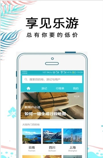 享见乐游,专业的旅行指南平台。在这里,驴友们的旅行攻略实时更新,随时随地都能查看。无论是查询目的地指南、浏览游记攻略,还是抢购特价折扣、及时了解行程安排,享见乐游 APP 统统为你搞定,让你的旅途一切尽在掌握之中!
