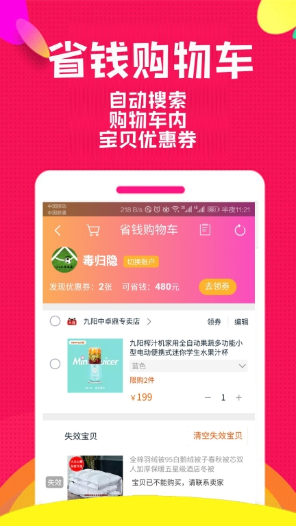 4、当系统自动搜索出购物车内商品的优惠信息后,点击相应按钮前往电商平台进行下单操作。