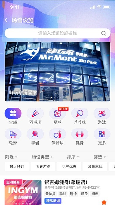 2. 切换到“场馆设施”页面,依据运动类型筛选足球、游泳等场馆,同时查看距离及详情。