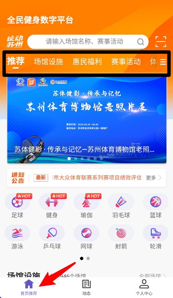 1. 轻点“首页推荐”,即可查看赛事公告、热门项目分类以及场馆推荐,从而快速获取关键信息。